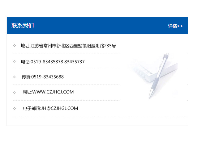 地址:常州市新北區友邦商務大廈1幢16、17層  電話:0519-85101652  傳真:0519-85112595  郵編:213022  網址:www.cz-jiayue_cn.sxminhang.com  郵箱:xiajifengaa@163.com
